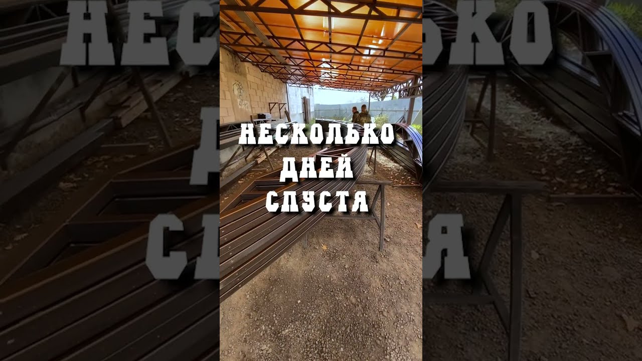 Металлический навес арочного типа с кровлей из поликарбоната для нескольких автомобилей 13,5*7,5